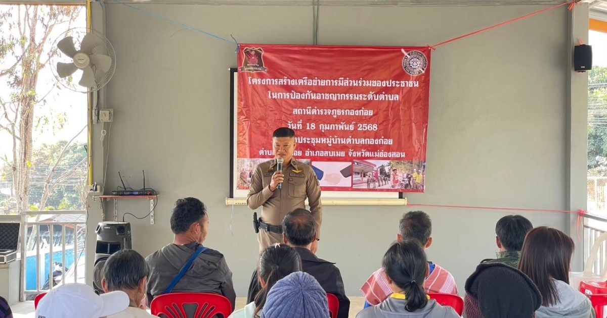 วันที่ 18 กุมภาพันธ์ 2568 09.00น. พ.ต.ท.ณกรณ์ ศรีกันทา สวญ.สภ.กองก๋อย เข้าร่วมเปิดโครงการอบรมโครงการการสร้างเครือข่ายการมีส่วนร่วมของประชาชนในการป้องกันอาชญากรรมในระดับชุมชน ให้แก่ ชาวบ้าน ม.1 ต.กองก๋อย อ.สบเมย จ.แม่ฮ่องสอน